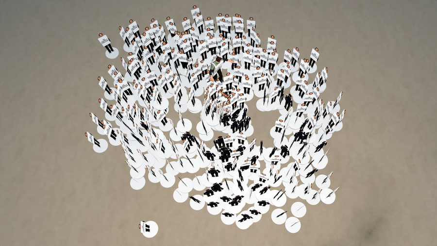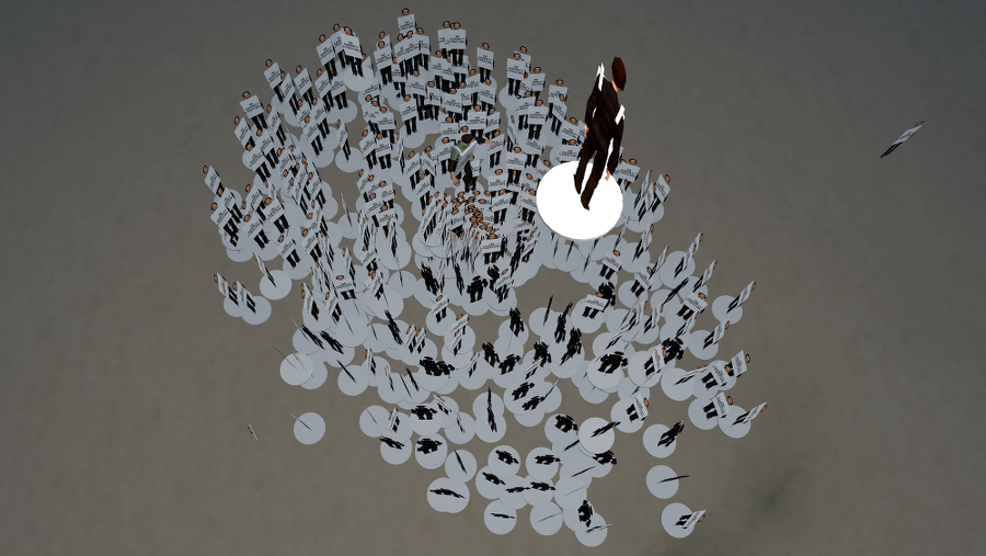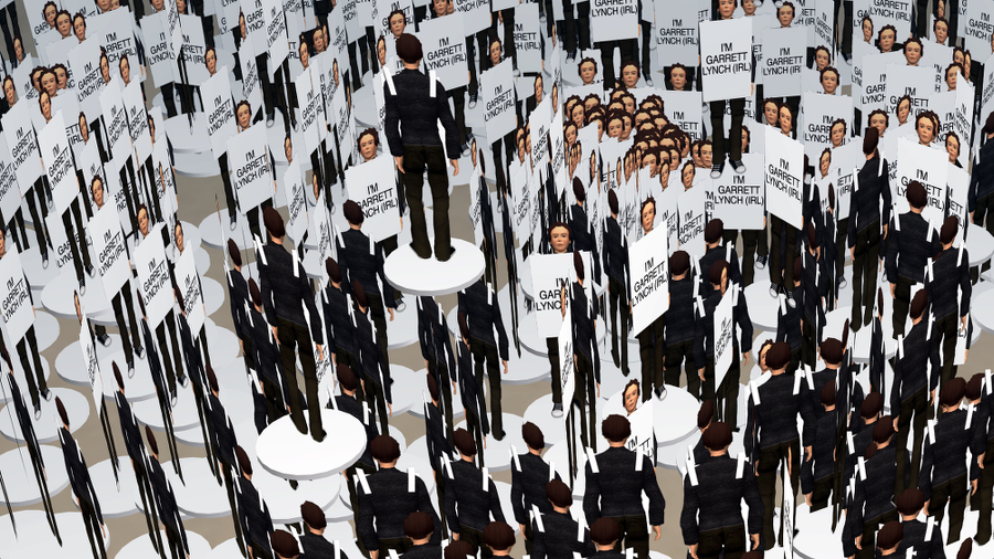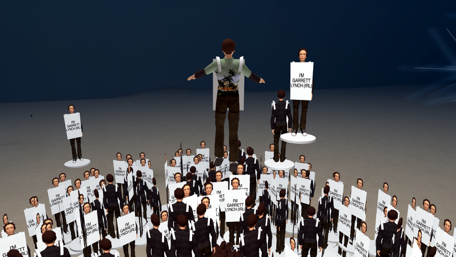 A flashmob performance at the Push simulator (now deleted) in Second Life. The performance consisted of flooding an area of the simulator with replicas of my representation in Second Life. These were in essence copies of a copy (the original being my ‘real’ physical self) which when seen en masse can not be distinguished from the ‘original’ copy but on closer inspection are flat degraded representations similar to cardboard cut-outs.