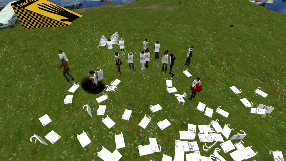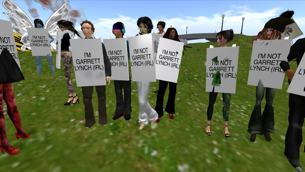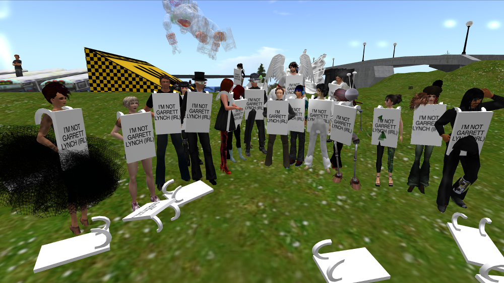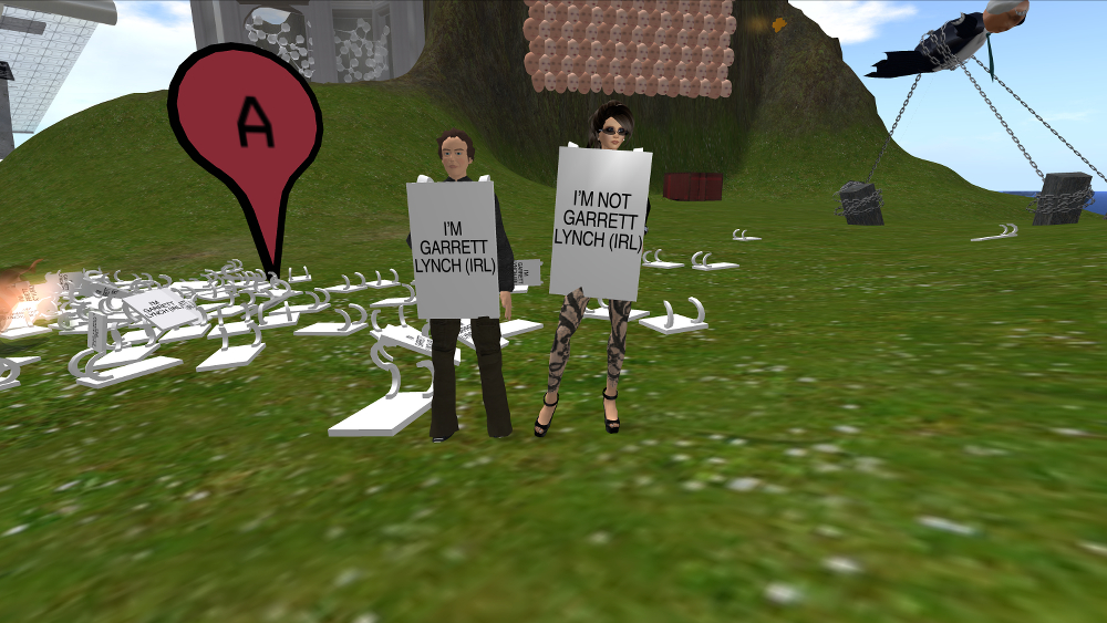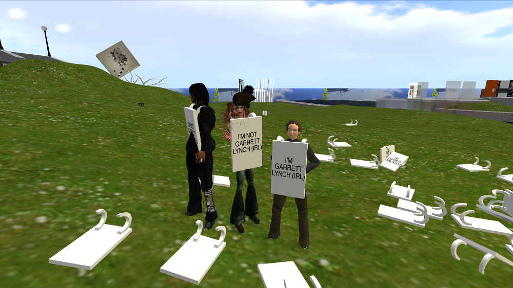 Twenty eight people participated in the performance in total including Alazi Sautereau, Apmel Goosson, Birkenkrahe Aya, Bruce Rathmullah, Chantal Harvey, Dekka Raymaker, dino Ferina, Drifter Rhode, Fau Ferdinand, Gliese Starsider, Jo Ellsmere, Jurassic Moonites, Kandinsky Beaumont, Karllos Decosta, Kikas Babenco, lizsolo Mathilde, Lollito Larkham, Marmaduke Arado, Maya Paris, Millimina Salamander, Naomi Greenberg, Nutski Newman, Penumbra Carter, Selavy Oh, Simotron Aquila, spirit Radikal, ush Underwood and Ze Moo. When each participant wore a sandwich board it changed to state “I’m not Garrett Lynch (IRL)” and they sent me an email in ‘real’ life to log their identity and location in the following format: